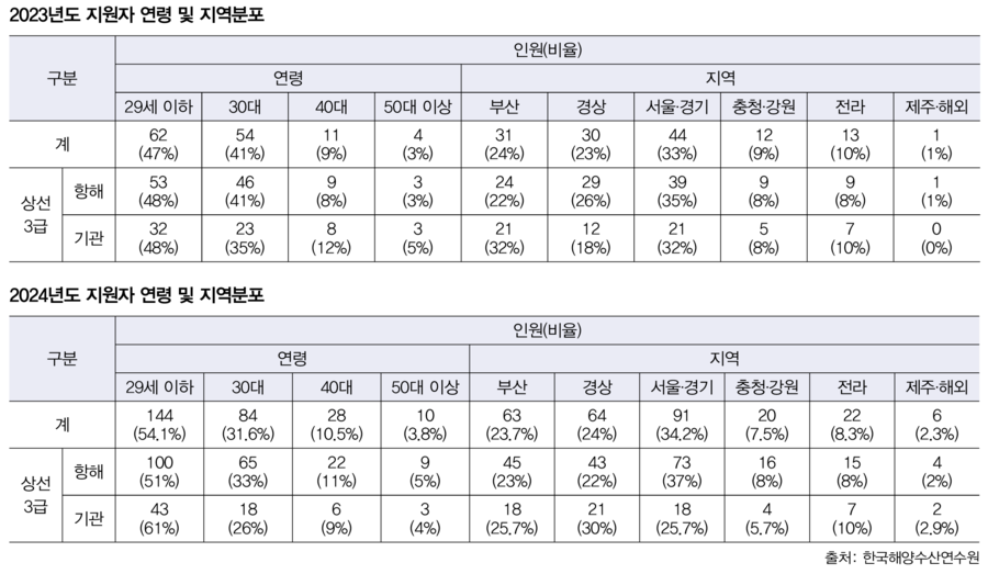- 2024년도 지원자 기준, 29세 이하 54.1% 와 30대 31.6%가 전체 지원자의 86%를 차지했으며, 40대 11%, 50대 이상도 4%였다. 지역별로는 서울·경기(34.2%)와 부산·경남(47.7%)에서 82%가 지원했습니다.