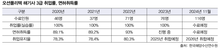 - 오션폴리텍 해기사 3급 과정에서는 전문대 이상 졸업자 또는 학점은행제로 80학점 이상 이수한 자를 대상으로 1년 6개월로 단축해 3급 해기사를 양성합니다. 4년이 아닌 1.5년 만에 동일한 면허를 취득할 수 있는 점은 큰 장점입니다.