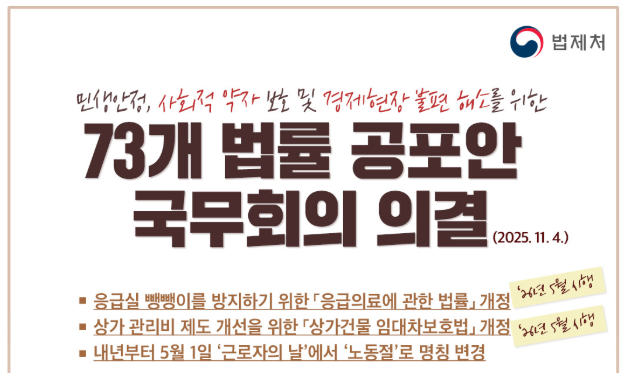 이번 공포안에는 ‘응급실 뺑뺑이 방지법’, ‘상가관리비 투명화법’, ‘노동절 명칭 변경법’ 등 국민 생활과 밀접한 주요 개정 내용이 포함되어 있습니다.