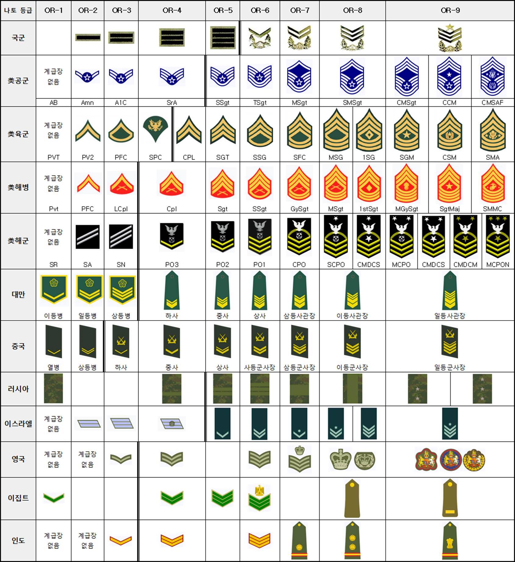| 구분 | 한국 | 미군 | 대만 | 호주 | 일본 |